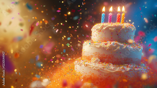 Tort urodzinowy. Kartka urodzinowa z balonami i konfetti. Urodziny, rocznica, jubileusz
