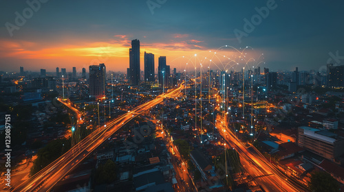 Smart digital Innovation city with connection network reciprocity over the cityscape. of future smart wireless digital city and social media networking systems that connects people with in city