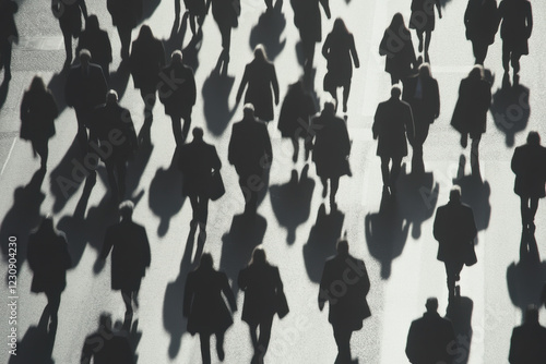 A group of people walking down a street with their shadows cast on the ground