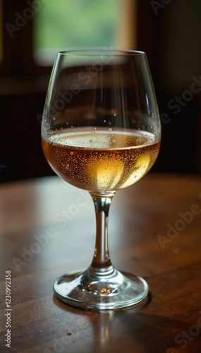 Fine crystal glass with clear liqueur inside resting on a wooden table top, table, liquor,