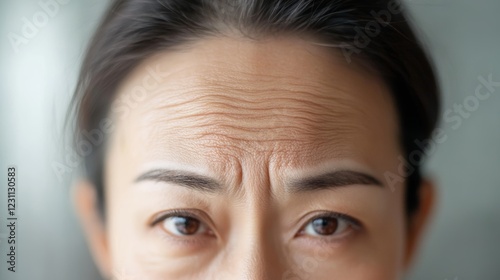Asian woman with wrinkles on the forehead closeup photo blurred