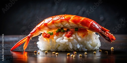 Prawny Goodness: Gunkan Sushi Topped with a Spicy Shrimp on a Dark Table