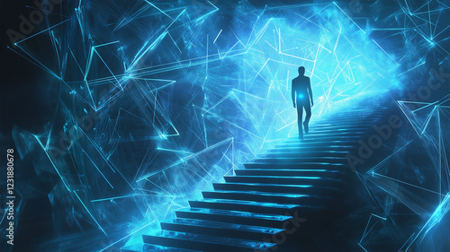 デジタル空間で光る階段を上る男性