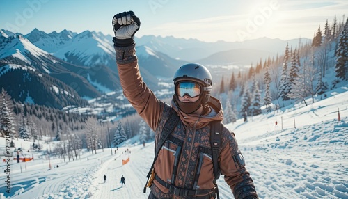 fSnowboarder A thrilling depiction of a man raising his fist in triumph at a ski resort, capturing the exhilaration and freedom of snowboarding in a beautiful winter landscape.