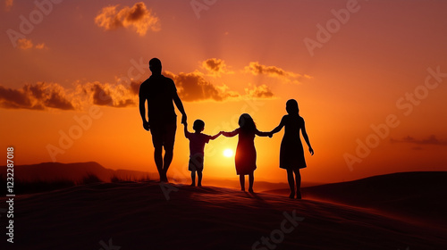 Rodzina trzymająca się za ręce na tle zachodu słońca