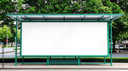 Blank Billboard Mockup at Modern Bus Stop Under Green Trees on Clean Pavement, Ideal for Advertisement or Presentation
