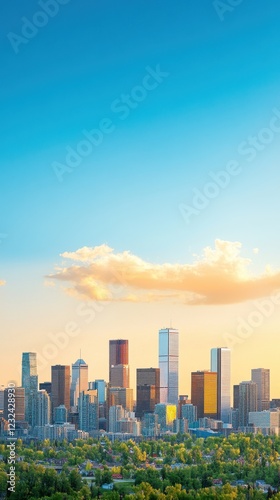 Stunning panoramic view of a modern city skyline at sunset with vibrant clouds, showcasing skyscrapers and lush greenery in the foreground for a captivating urban landscape.