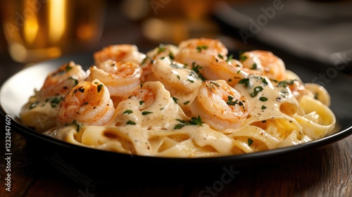 Plate of pasta dish with shrimp and sauce. the pasta appears to be fettuccine alfredo, with a creamy white sauce and chunks of shrimp scattered throughout.