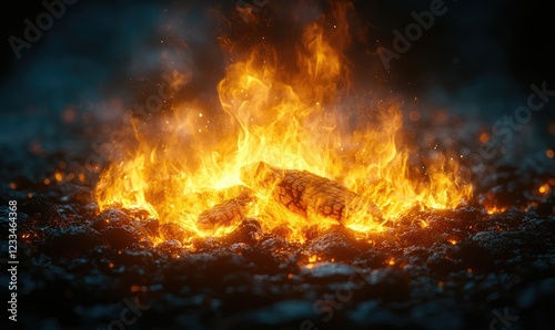 A vibrant campfire with glowing flames and charred wood, creating a warm atmosphere.