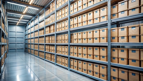 Organized storage unit with rows of labeled boxes on metal shelves, featuring stacked files and folders in a systematic arrangement, shelving, archives