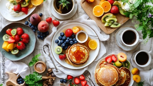 A top-down view of a breakfast spread with pancakes, fruits, and coffee