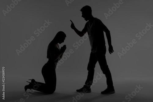 Domestic violence. Silhouette of man threatening his wife on grey background
