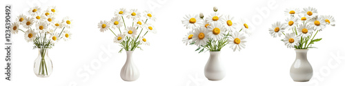 Daisies arranged in several white vases showcasing vibrant spring beauty in a bright setting