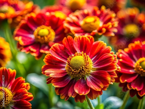 Vibrant Red and Yellow Garden Flowers, Shallow Depth of Field, Macro Photography