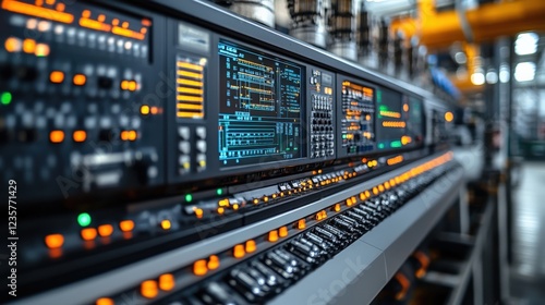 #775071590A bustling technology control room with glowing digital screens displaying data. The atmosphere is modern and high-tech.
