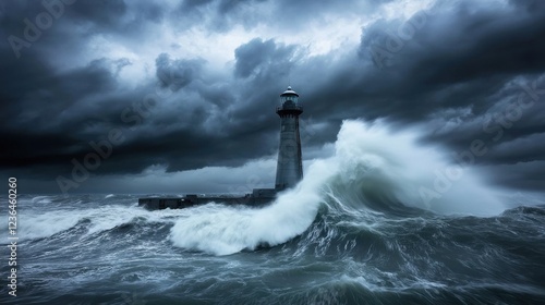 Lighthouse Amidst Stormy Waves and Dark Clouds in Dramatic Scene