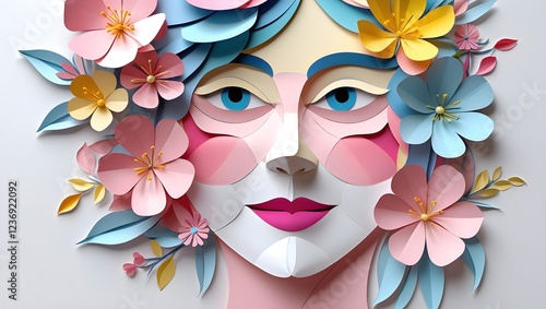 Vibrant illustration of a stylized, simplified female face, composed of intricately layered paper cutouts in pastel shades of pink, blue, and yellow, adorned with delicate, hand-drawn flowers.