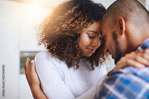 Happy couple, relax and hug with comfort or embrace for love, empathy or compassion at home. Man, woman or forehead with touch, trust or commitment for affection, care or support together at house