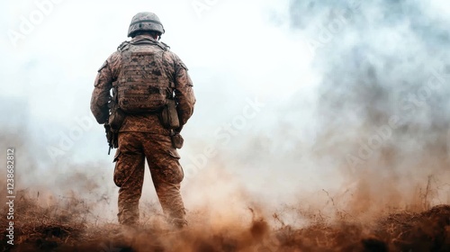A soldier stands strong amidst smoke and fog, embodying resilience and determination in the face of adversity, showcasing the harsh realities of military duty.