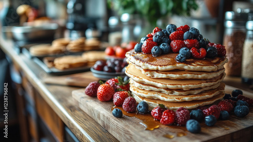 A family preparing breakfast together in a bright kitchen, with pancakes and fresh fruit on the counter