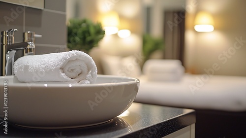 Rolled towel on sink in hotel bathroom, bedroom background
