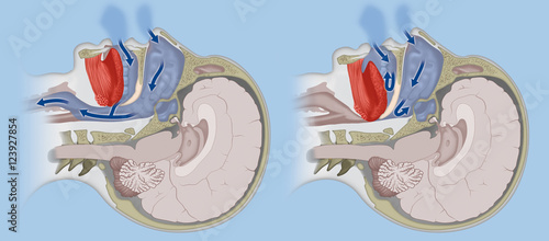 A cross section of a human head, comparing normal breathing with sleep apnoea