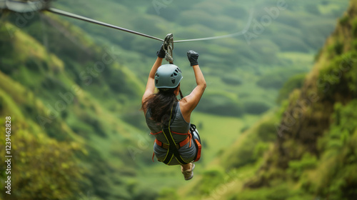 Woman in helmet and harness ziplining over a vibrant green valley. A thrilling outdoor adventure surrounded by lush tropical hills and scenic landscapes