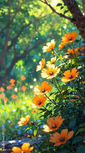 Yellow wildflowers dancing in the breeze on a sunlit meadow near towering trees Anime Wallpaper Background Illustration Aesthetic