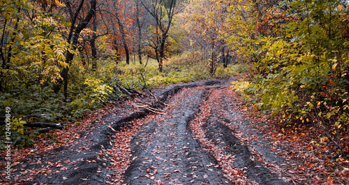 Autumn road in the forest with red leaves in a deep rut