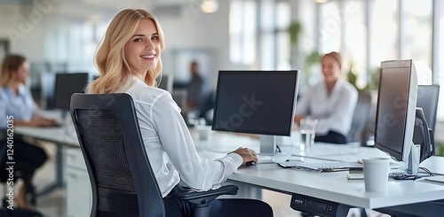 Caucasian female adult smiling in modern office environment with computers
