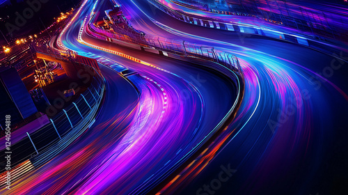 Glowing aerial view reveals vibrant race track illuminated by colorful lights at night