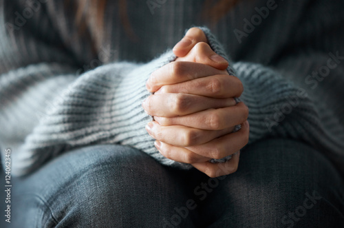 Stress, anxiety and hands of scared person with worry, fear or abuse in closeup, home or danger. Depression, lonely and insecure victim with phobia, mistake or crisis with nervous gesture or trauma