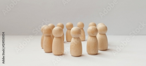Group discussion among wooden figurines minimalist setting photography neutral background creative concept