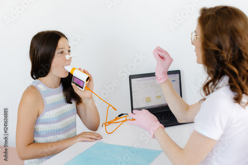 Girl testing breathing function by spirometry in doctors office. Diagnosis of respiratory function in pulmonary disease