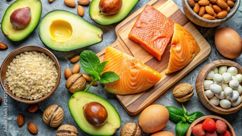 A selection of delicious Keto-friendly foods including avocados, eggs, cheese, nuts, and salmon , Keto diet
