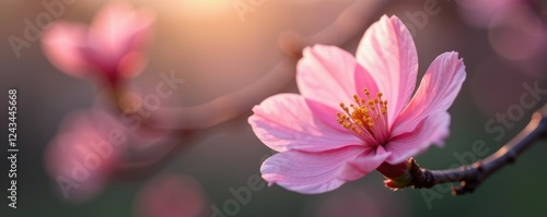 Soft pink petals unfurl from almond-shaped blossoms, delicate, growth