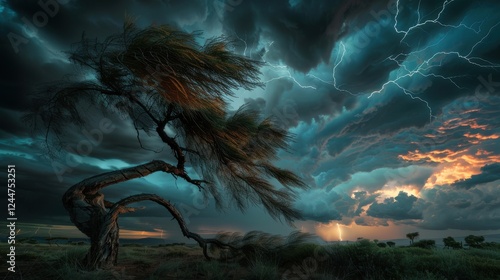 Dramatic stormy sky explodes with lightning. A lone acacia tree bends low, its branches whipping in the fierce wind. Nature's raw power on display.