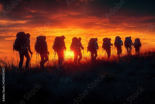 Silhouetted Hikers Against Glowing Sunset in Mountains