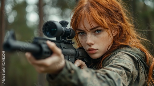 A skilled young redhead woman participates in tactical gun training at an outdoor shooting range surrounded by trees, showcasing focus and determination while aiming her rifle