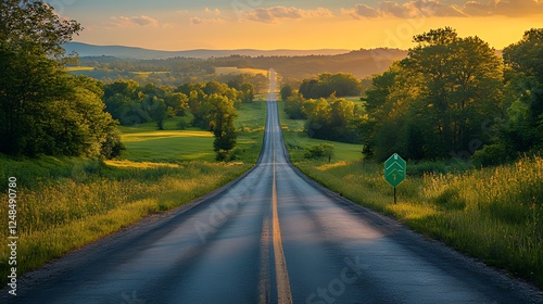 Sunset highway vanishing point, rural landscape, travel