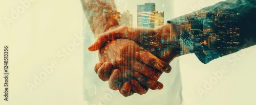 Double exposure of a handshake with a city skyline.