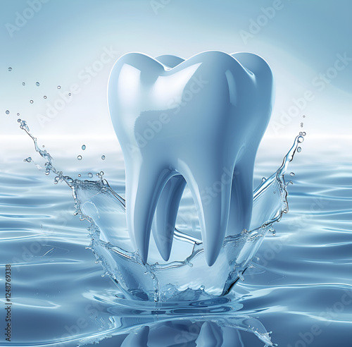 Błyszczący biały ząb zanurzający się w wodzie, tworząc efekt rozprysku na tle jasnej, niebieskiej scenerii.