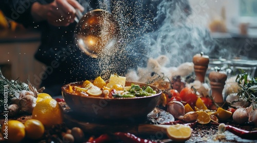 Dynamic cooking scene with spices and flames