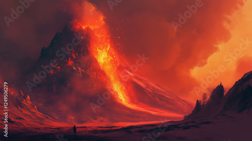 Erupting volcano with flowing lava and lone figure in fiery landscape