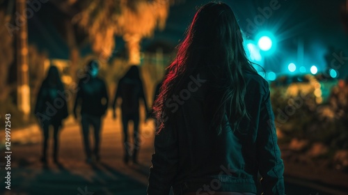 A young woman with long hair stands alone in the foreground, viewed from behind, as a threatening group of hooded figures approaches her in a dimly lit urban area at night