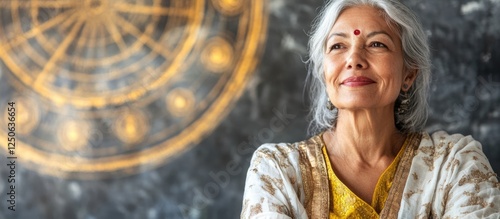 Senior woman engaged in Vedic astrology for financial insights against a textured backdrop with space for text or messages.