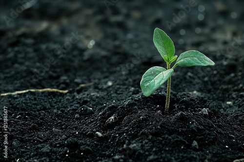 Pequeña planta emergiendo de la tierra húmeda, con hojas frescas y gotas de agua sobre ellas, simbolizando el crecimiento.