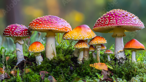 Mushroom garden with diverse fungi, vibrant and lush, botanical, soft greens, photograph, natural beauty. Fungal Kingdoms. Illustration