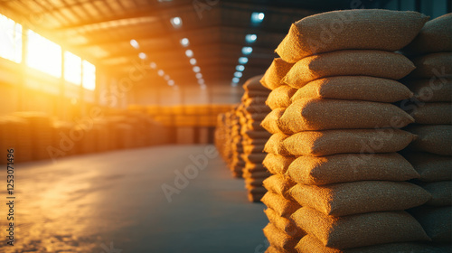 Staged sacks of agricultural inputs in warehouse, illuminated by warm sunlight, create productive atmosphere for farming supplies