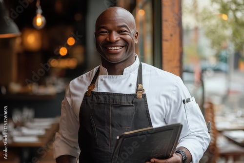 Smiling chef in restaurant setting, holding menu. Perfect for hospitality, food, and restaurant websites.
